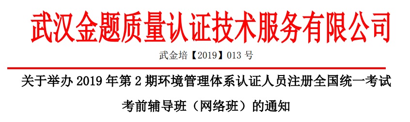 中国认证认可协会CCAA于2019年9月19日发布《关于举办2019年第2期认证人员注册全国统一考试的通知》,其中规定认证人员注册全国统一考试将于2019年11月23日、24日举行。武汉金题质量认证技术服务有限公司联合全国各地多家认证机构,共同开办网络课程(ISO14001环境管理体系审核员考前辅导班),帮助零基础的学员尽快通过全国统一考试。本次ISO14001国家注册环境管理体系审核员的全国统考具体日期和时间为:2019年11月24日,上午09:00-11:00的考试科目为“EMS审核知识”,下午14:00-16:00的考试科目为“EMS基础知识”。考试地点:在福州、南京、广州、重庆、西安、济南、武汉、上海、北京、长春、青岛、郑州、合肥、沈阳、天津、乌鲁木齐、成都、贵阳、长沙、杭州、昆明等21个城市同时进行。网络课程的优点:采用网络技术,进行远程辅导,学员可以利用工作与休息的碎片化时间,随时学习,不仅减少学员的各种差旅成本,也能节约大量的时间成本。