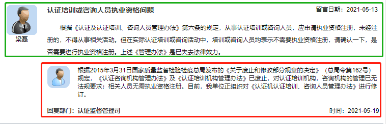 第一个常见的问题和误区是:认证培训机构或公司,应该要有政府部门的批文和资质,否则就是违法违规的。实际上这个问题,进入市场管理总局的网站,在公众留言中,就有明确回复: