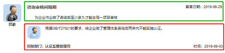 第二个常见的问题,就是审核员能不能做咨询的问题,有的情况是实习审核员为了给自己积累实习经历,所以找亲朋好友推荐一些企业做认证,有的是正式审核员受到其它相关方邀请,为企业在审核前提供咨询服务。根据审核的难度,这类咨询分为两种,一种是仅仅就是在受审核方提供一些必要的信息的情况下,编制一些审核前必须的文件和记录;另一种是需要根据受审核方的需求,为受审核方提供现场评估、培训、协助编制文件、讨论和修改文件等工作。关于这类问题,进入市场管理总局的网站,在公众留言中,也有明确回复:
