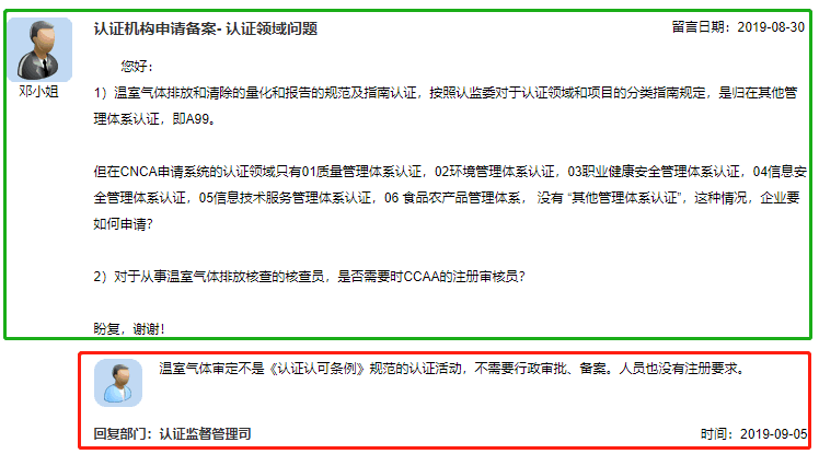您好:1)温室气体排放和清除的量化和报告的规范及指南认证,按照认监委对于认证领域和项目的分类指南规定,是归在其他管理体系认证,即A99.但在CNCA申请系统的认证领域只有01质量管理体系认证,02环境管理体系认证,03职业健康安全管理体系认证,04信息安全管理体系认证,05信息技术服务管理体系认证,06食品农产品管理体系,没有“其他管理体系认证",这种情况,企业要如何申请?2)对于从事温室气体排放核查的核查员,是否需要时CCAA的注册审核员?盼复,谢谢!
