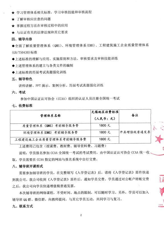 帮助学员掌握质量管理体系(QMS)、环境管理体系(EMS)、工程建筑施工企业质量管理体系(GB/T50430)标准知识,帮助学员学习与提升认证人员(注册审核员)审核技能,有效胜任上述标准的内部审核、外部审核(第二方认证审核、第三方认证审核)工作。