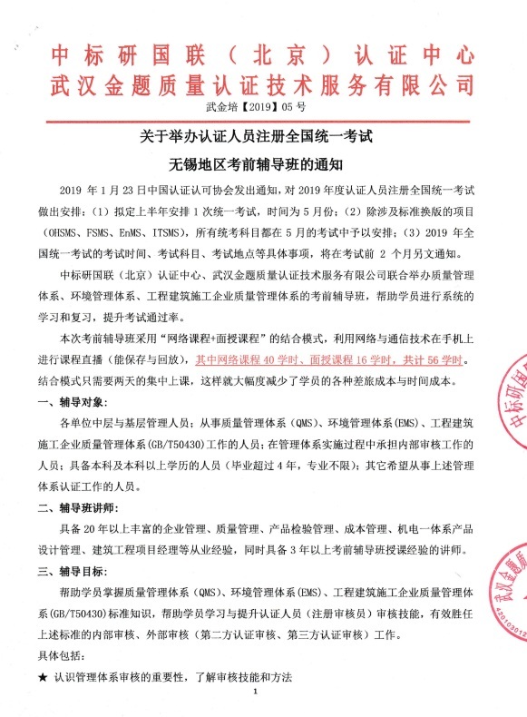 中标研国联(北京)认证中心与武汉金题质量认证技术服务有限公司于2018年8月、2018年11月已经成功举办两期认证人员注册考前辅导班(面授班)。在之前的合作基础上,现决定于2019年4月13-14日继续开办考前辅导班。